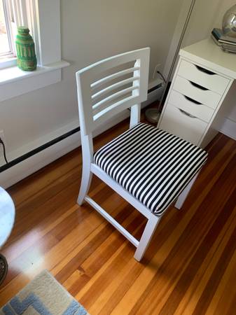 Midcentury painted dinning chairs with upholstered seats. Minor signs of wear. Wonderful to use as is. Easy to re-paint or re-upholster, if desired. Three chairs available. $20 per chair. Easy North...