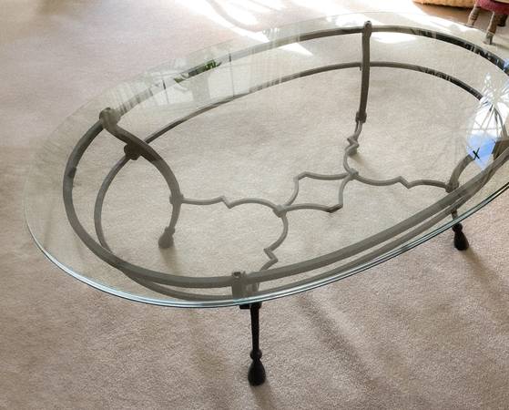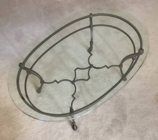LIKE NEW - custom-made, wrought-iron coffee table with oval, ogee-bevel glass top (1/2" thick). Measures: 54" x 35" and 20" high. Original retail over $850 Pick up in Smithfield. Include phone...