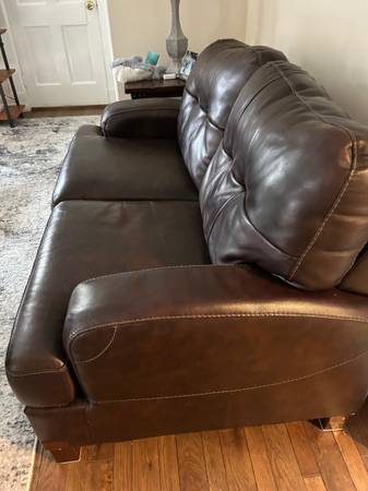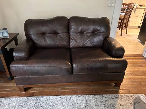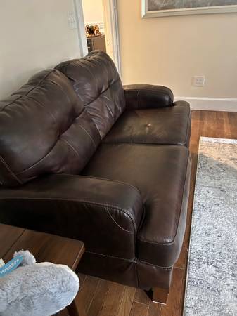 Free- Ashley Furniture leather loveseat. Has some nicks and wear from moves One leg attachment was damaged a while ago, but have been using it since.