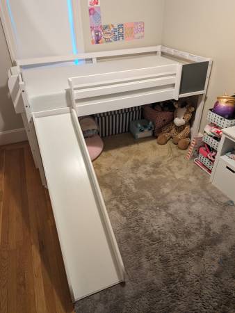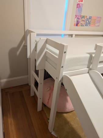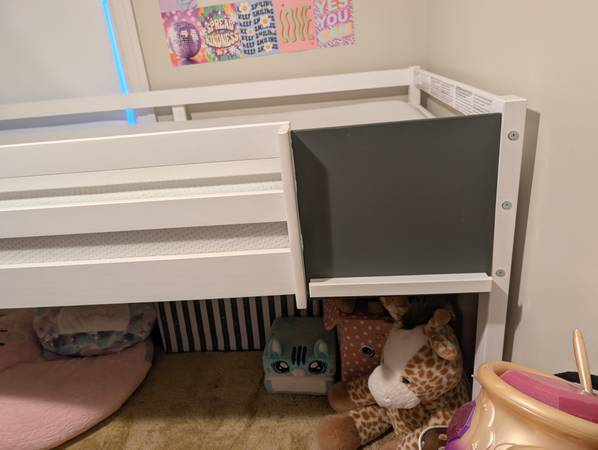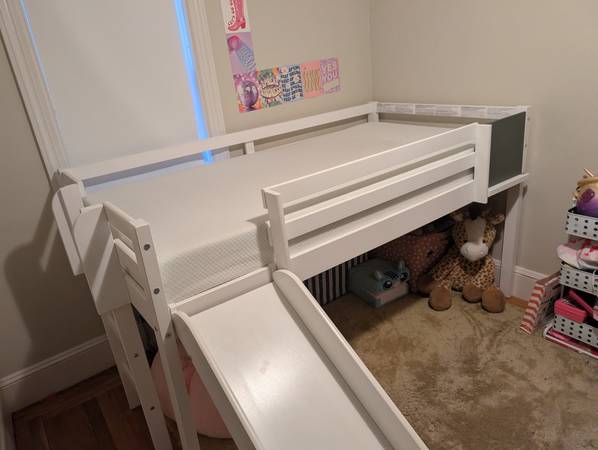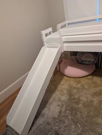 Gently used white loft bed for small child. Includes ladder, slide, and chalkboard. Does not include mattress, but will consider for additional fee. Light assembly required. Instructions and tools...