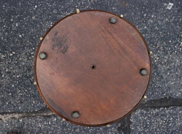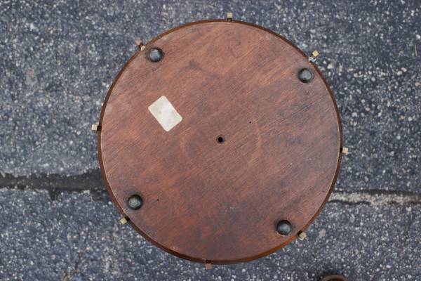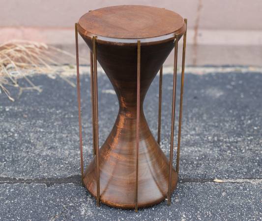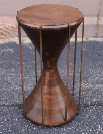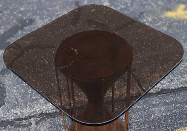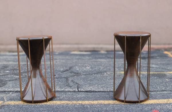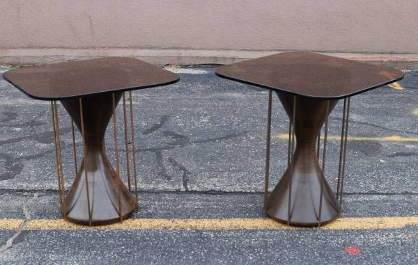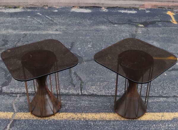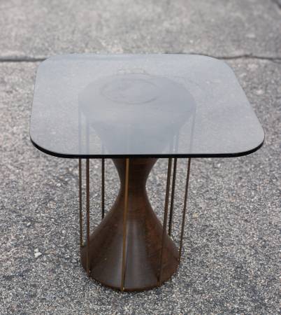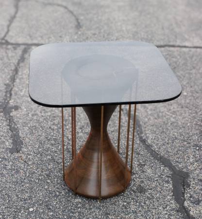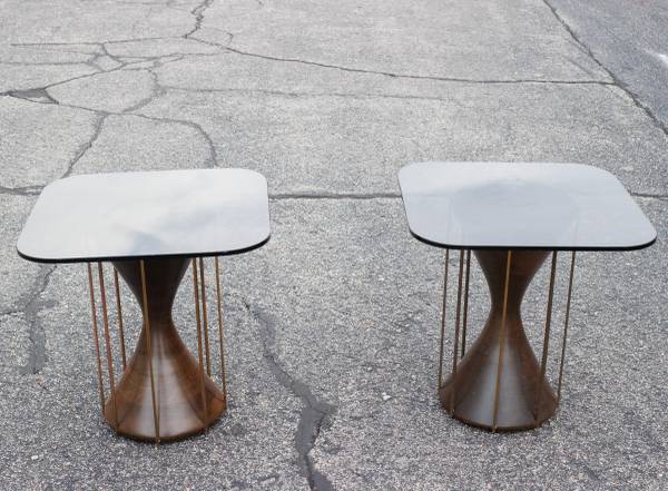 Pair of very unique vintage mid century modern MCM side tables. Two heavy 21 1/2in squares of smoked glass that sit on top of two drum shaped or hourglass shaped wood and brass bases. Have an almost tribal look to them. A djembe or talking drum come to mind. Good for a tiki bar fan or any MCM fan.