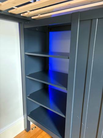 Blue Pottery Barn youth bunk bed, desk, book shelf and dresser in one! https://www.potterybarnkids.com/products/camp-bunk-system/