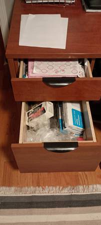 Very nice solid wood not particle board probably cherry wooden office desk. One large and one small drawer on each side. Room for a standard office chair in the middle. Adjustable in four corners for imperfect floors. 60 inch x 30 inch top surface. 30 inch height. Lightly used but no damage. $60 obo. Delivery not available but I can help carry it Into your large car or truck if you're helping too.