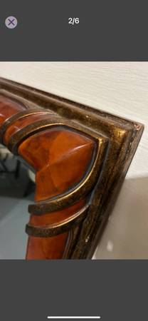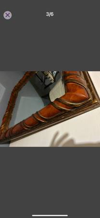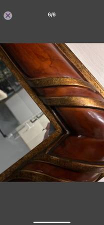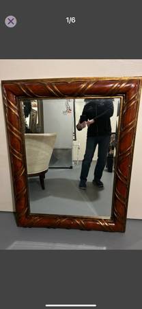 For sale a nice big size framed mirror . Molded frame . The mirror has in the back sturdy hanging brackets already installed and can be placed either horizontally or vertically . The approximate size is 50”x40”. The mirror itself is made out of thick glass and has beveled edges which gives it a classy look . If interested you can reply to this add or text me at show contact info