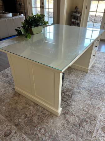 Like BRAND NEW. Elegant and spacious custom made executive desk. Neutral ivory color with elegant wood paneling on all sides. Big work space for many uses. Includes custom glass top, drawers, pull out shelf.