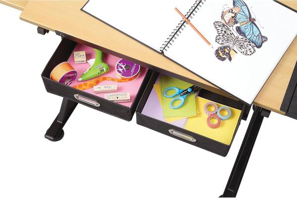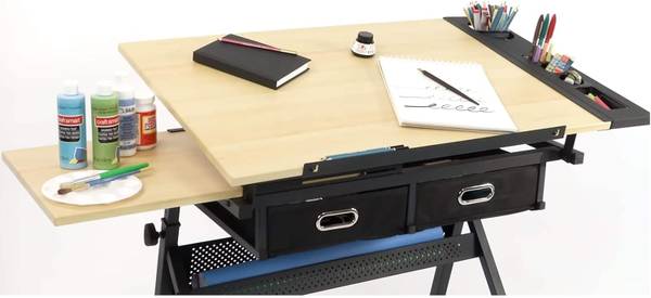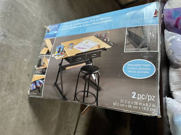 Kids art desk, brand new in box. Has never been used. Table surface 34 x 24 inches, 24 inch side up pencil ledge. Additional storage under table. Four levelers for stability. Art tray and cup holder for pencils, brushes and supplies. Padded adjustable stool included.