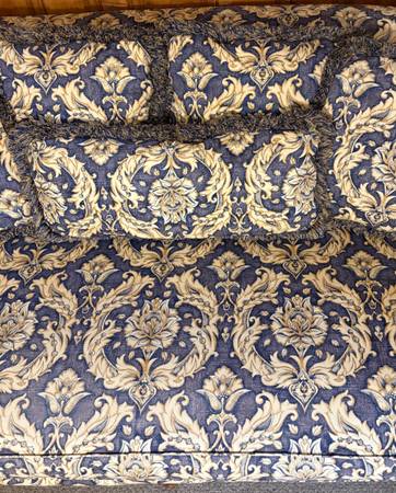 - Premium custom damask upholstery (deep navy, cream, and gold tones)