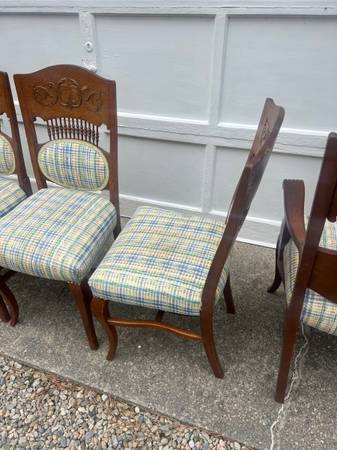 These are six antique oak kitchen dining room chairs.
