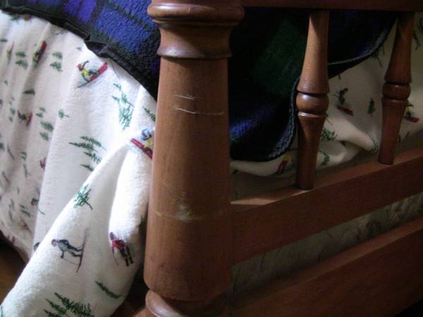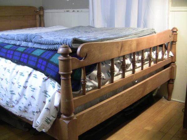 A cool, solid bed frame. It's older and shows some wear (a few small scratches and nicks). The bed frame will be taken apart when you get here. I will throw in the mattress (full size Linenspa hybrid- foam top & springs) and box spring for an extra $50, if you're interested. Just a heads up, you will need a box spring for this bed frame. Email me or text: 56one-346-27one4