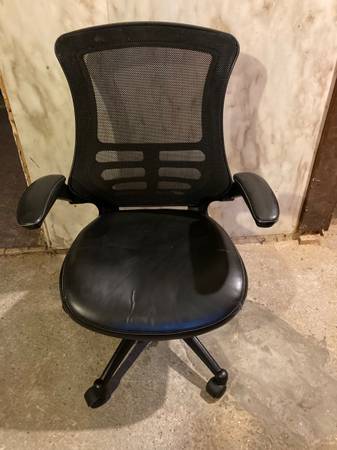 Black leather desk chair small gash in seat $25.00pick only email for inf