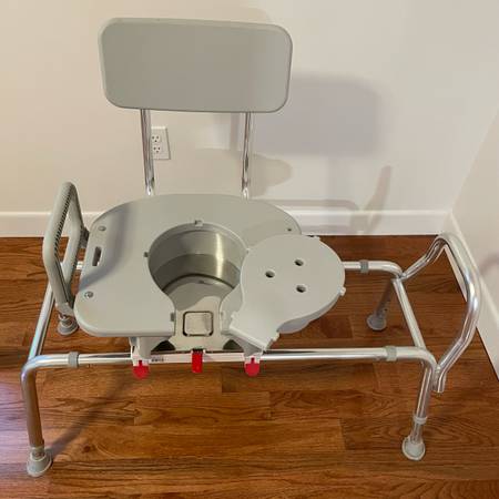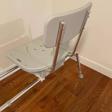 Sliding tub transfer bench with swivel seat, this bench is in like new condition and barely used! Purchased six months ago for $300. The seat has a removable cutout for easier access to clean, weight capacity is 400 lbs and seat swivels 360 degrees to make getting off the seat very easy. Sturdy construction!