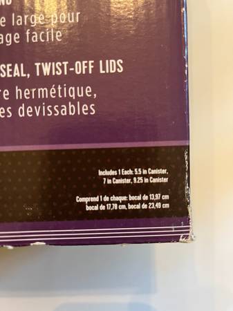 Mr. Coffee 3 Piece Canister Set Clear bottoms to see contents Wide-mouth lip for easy filling Air tight seal, twist-off lids Includes 3 sizes: 5.5", 7" and 9.25" $18 for the set. Cash only.