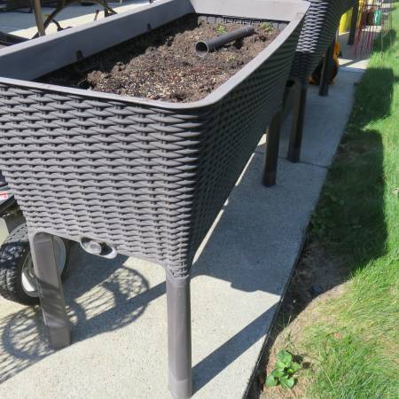 have 3 brown elevated planting beds on legs. They have a drain on the side. Made a very durable (i think a polymer/resin) material. They have been outdoors for a few seasons and still look new. Nothing wrong with them at all, just no longer need. Asking $60 each. They were $125 new each. They are full of soil and extremely heavy due to that.