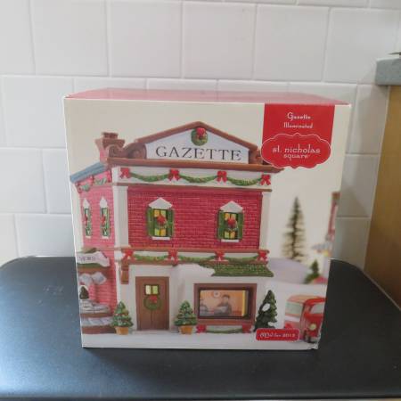 Have a St. Nicholas Square Gazette, part of Christmas village displays. This one was new in 2013. Its brand new in the box and has never been opened. I will also be posting the "harbor steak and seafood restaurant" and the "village public market" in separate listings. Will give a little better price if you buy all 3.