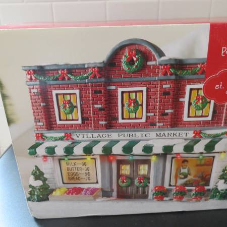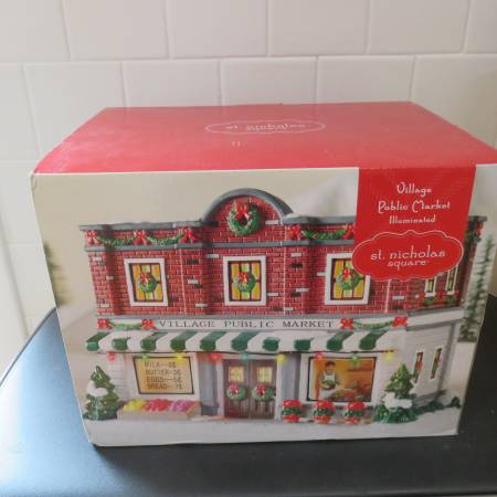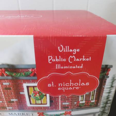 Have a St. Nicholas Square Illuminated Village public market, part of Christmas village displays. This one is from 2013. Its brand new in the box and has never been opened. I will also be posting the "Gazette" and the "Harbor steak & seafood restaurant" in separate listings. Will give a little better price if you buy all 3.