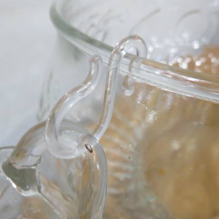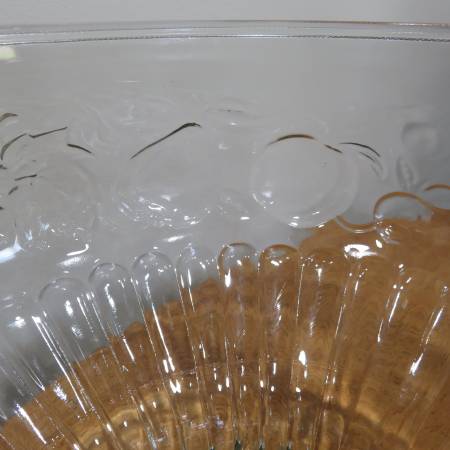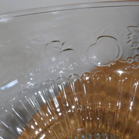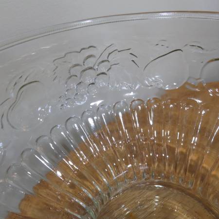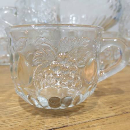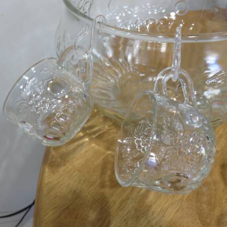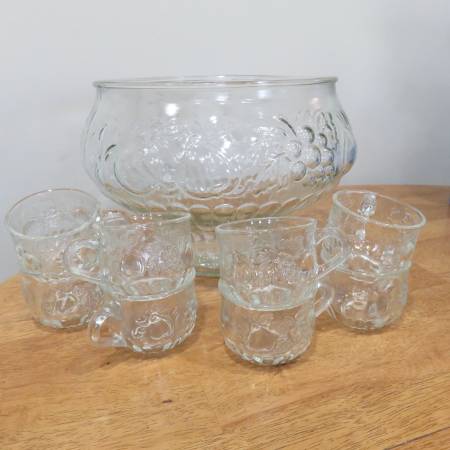 Selling a vintage Jeannette punchbowl with 8 glasses and hooks so they can hang on side. It has an embossed pattern of fruit all over, Apples, pears, and grapes. It is in excellent condition and has been stored and unused for more than 20 years. It measures 9 3/4 inches across and 7 3/4 inches high. The glasses measure 3 inches across and 2 1/4 inches high.