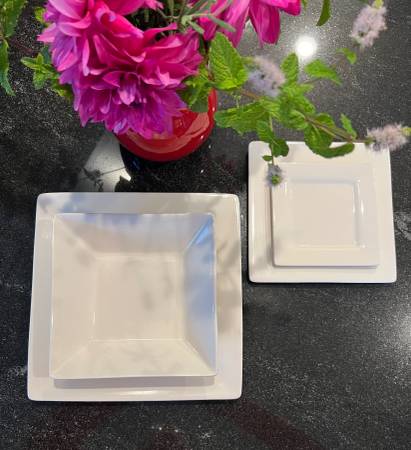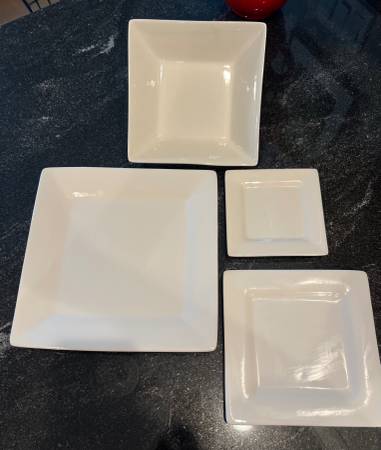 Lovely square set of dinnerware for 12. Dinner plate, salad/dessert plate, bowl, and small nibbles plate. All square. Charming.