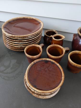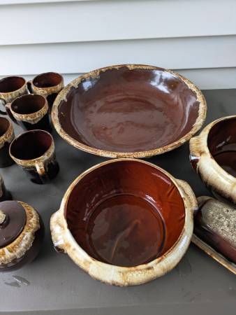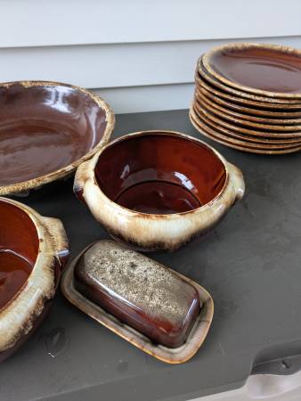 The right half is marked Hull on the bottom of all the pieces and includes ten 10" dinner plates, five, 6.5" salad or dessert plates, one bean pot with lid, 4 mugs, creamer and sugar bowl.
