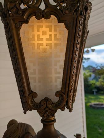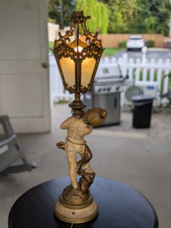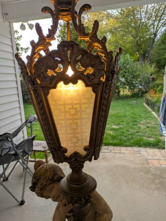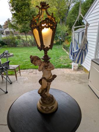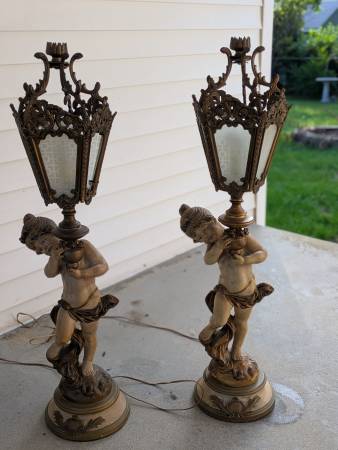 Beautiful pair of 1950's mid-century cherub lamps stamped Collection Francaise. Both lamps are in very nice condition with only a few imperfections (one missing glass pane, one lantern tip repair). The detail on the lanterns and the glass is amazing and they work perfectly. Each lamp has a 10" base and is 40" to the top. Very heavy and could be used on the floor or displayed on an accent tables.