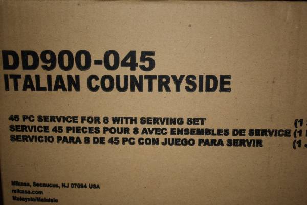 From Mikasa, Beautiful Stoneware in Italian Countryside Pattern. 45 piece Service for 8 complete including serving pieces. The set is Brand New in Box. Microwave & Dishwasher safe. Includes 8 Dinner plates, 8 Salad Plates, 8 Soup Bowls, 8 Cups, 8 Saucers, 1 Vegetable Bowl, 1 12" Round Serving Platter, Sugar Bowl with lid and Creamer!