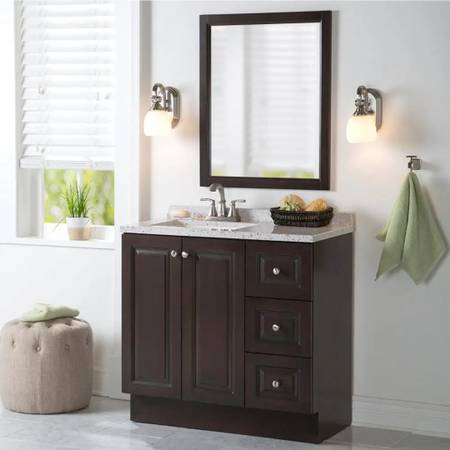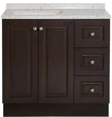 Pre-assembled open-back vanity with unattached sink top is ready and easy to install with silicone caulking; caulking sold separately