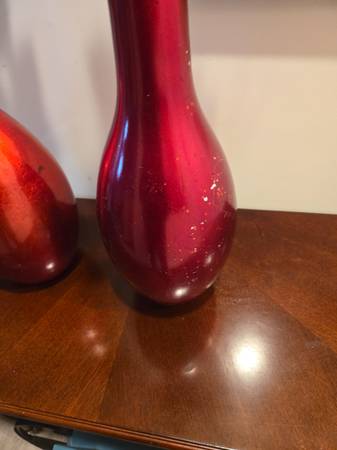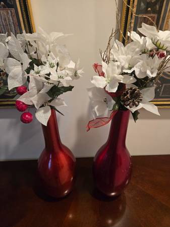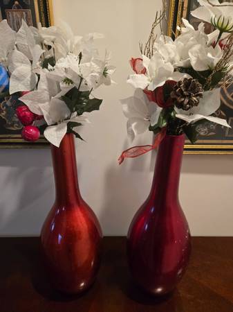 A pair (2) red Holiday Vases with floral arrangements. Some loss of finish to metallic glass. $15 for the pair. Location Narragansett Cash and carry