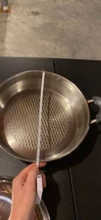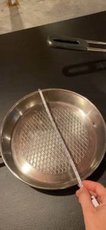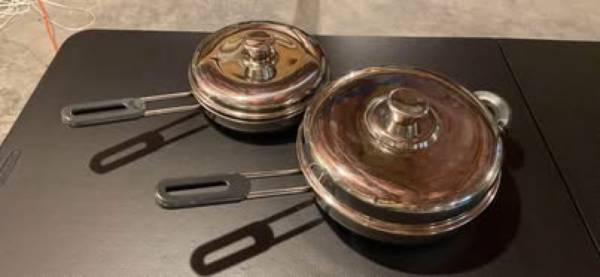 2 Steel Pride frying pans. Each with a cover. The smaller 9.5" pan is $20. The larger 11.5" pan is $30. Please note condition. Both pans are solid and in great cooking condition. You see the typical wear and tear markings on bottoms and lower angle of the edges. The handle for the smaller pan has a burn mark as noted in the photo. Cash only- or Zelle after you're here and I know that you're not a scammer :)