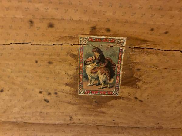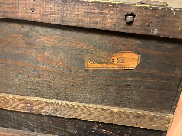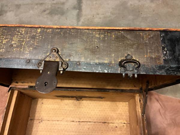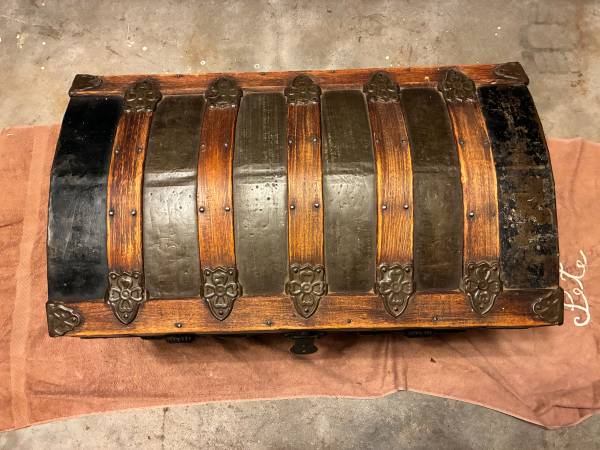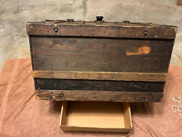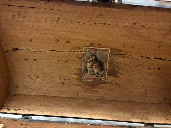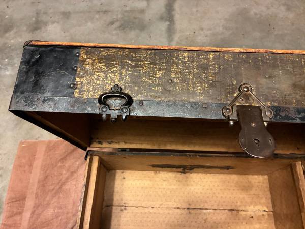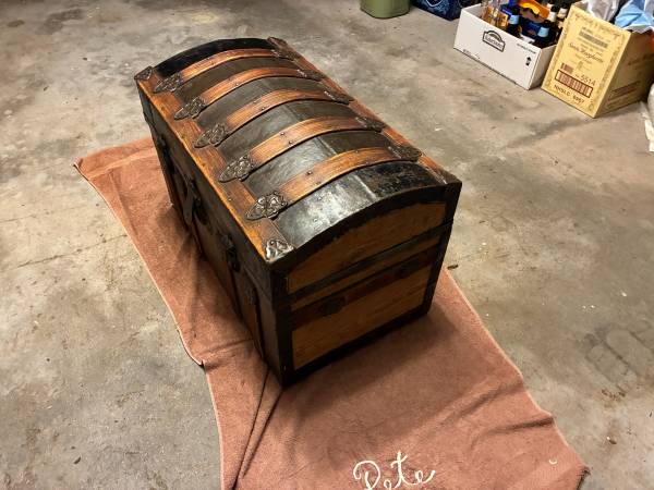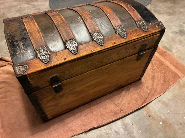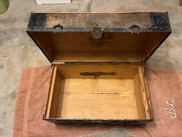 This is a Victorian dome top, humpback design steamer trunk from the late 19th or early 20th century. It measures 27 inches across, 15 inches deep, and 17 inches high. It may have been a child's trunk. It has a partial label on the bottom that says "Carolina size" which indicates its smaller size. It has oak wood slats, and the front and top are tin. The sides, back, and bottom are wood. They can be stained, painted, or left as is. The hardware is iron metal. The interior has the original paper and a lithograph print of a Victorian child with a dog. The crack that you see is only in the paper. All wood on the trunk is solid. The inside tray is missing as are the side handles. The front latches work well. The main lock has no key.