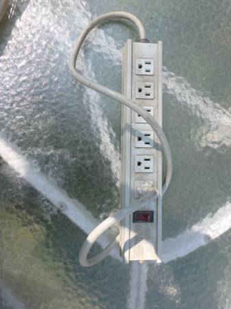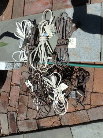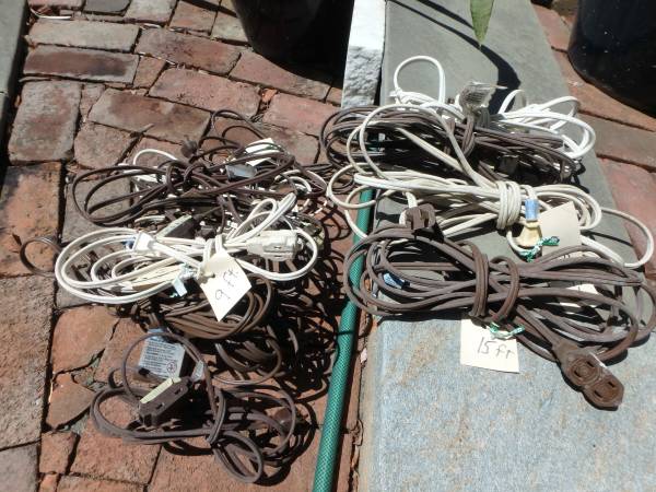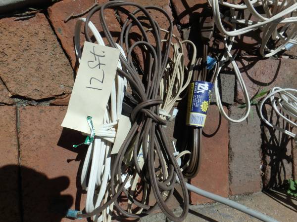 Ten 9 foot extension cords, plus a couple of 12 foot and 15 foot. Any of these at .20 cents/foot. Also, a 6 outlet power strip with 3 foot cord, takes either 2 or 3 prong plugs. $8. Also, 45 foot...
