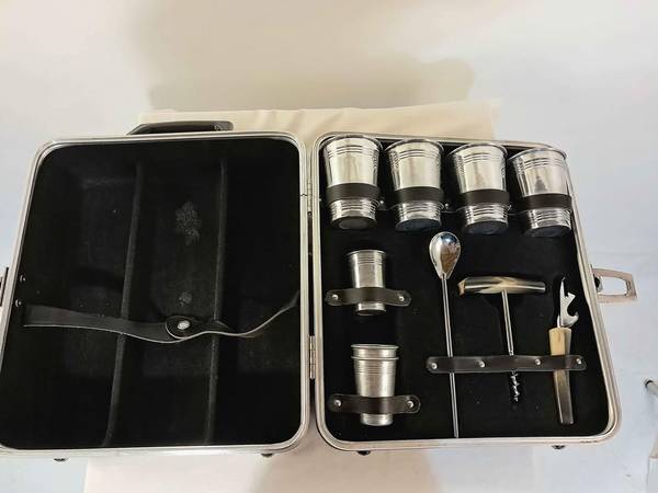Nice Portable bar. Comes with 4 metal cups, 3 metal shots,