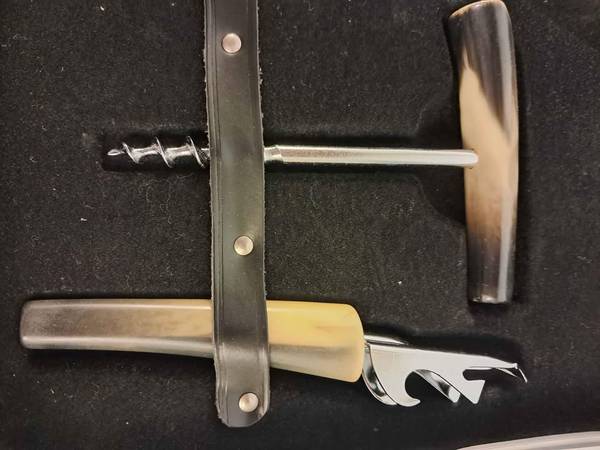 1 spoon, 1 cork screw, 1 can opener, holds 3 bottles.