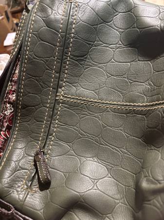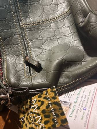 New, leather, olive colored purse by Tignanillo. The Simply Safari. $15. Long shoulder strap, can be adjusted. Roomy, 2 sections inside that zip seperately, plus outside zippered pocket on each side. Very roomy, pretty silk print inside $15 firm. Text me at show contact info