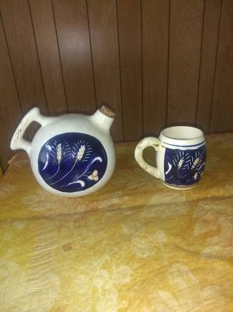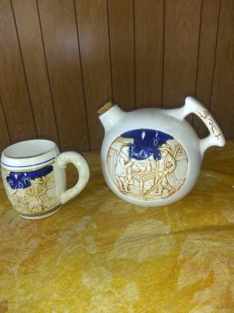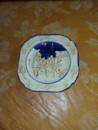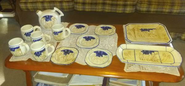 5 mugs, 5 small plates, one pitcher, two serving plates. Raised design depicting colonial tavern scene. Cobalt/wheat pattern on backs of mugs and pitcher.