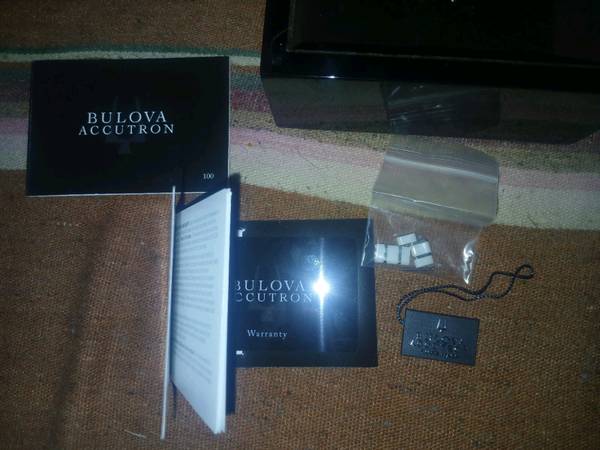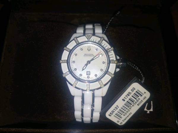A new in box Bulova Accutron luxury watch with 50 diamonds as its indices. Made of stainless steel and ceramic this watch comes in its original box with papers, extra links, and manufacturers warranty.