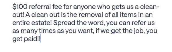 Hi all! We offer clean-out services and small junk removal jobs as well! We have been in this business since 2017. We are also now offering $100 referral fees for anyone who gets us a clean-out job. If we land the job, once we get paid, so do you!