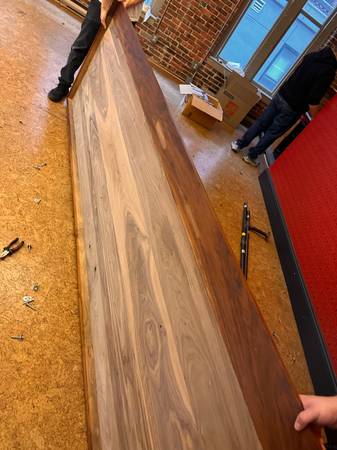 pecifications & Features Material: Premium Walnut Length: Approximately 10 feet L / 3ft W. Look/Finish: The wood is flat, sanded smooth, and finished with a durable clear coat. The edge is constructed (built-up) to give the table a substantial, commanding visual thickness of approximately 4 inches, while maintaining manageable weight .Condition: Excellent used condition.Its slightly under 10ft long.