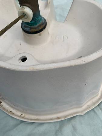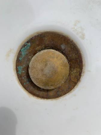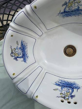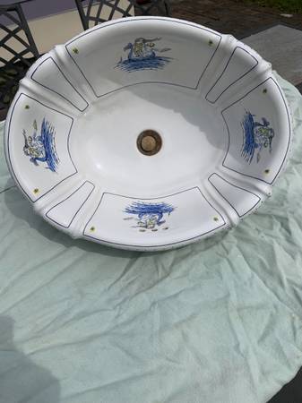 I am pretty certain this is Sherle Wagner but it is not marked. It is the same style and shape as their other painted sinks. The previous owner said it was "Cheryl Wagger" and hadn't seen much use. They were remodeling their beach house guest bath to be more kid friendly. It is the same style and shape as their other painted sinks. Sink is in excellent condition. Interior of bowl is a little dirty but should clean up well. The copper drain has some corrosion I show in the photos. There is a little bit of old caulk stuck underneath but overall excellent.