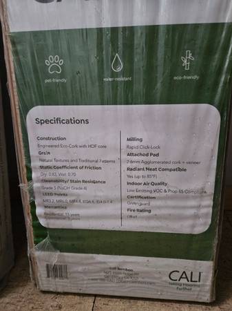 2 packs of Cali Cork flooring in packaging. Each originally $68, asking $30 for both. Bought more than needed for a home improvement project. Flooring is beautiful and wears well. See photos for...