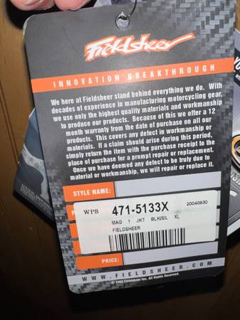 Brand new Fieldsheer padded mesh motorcycle jacket. Size XL. Looks cool and is very protective. Great deal for $50 firm.