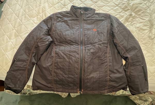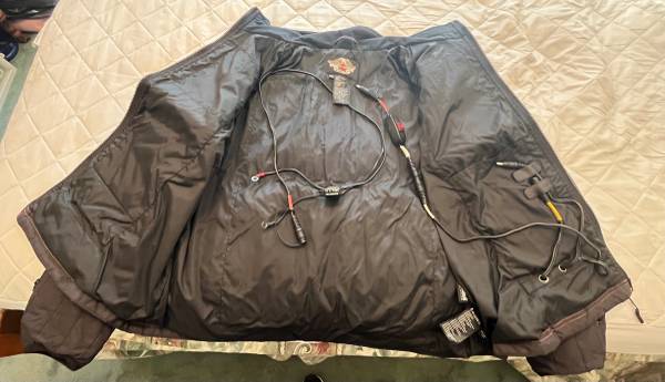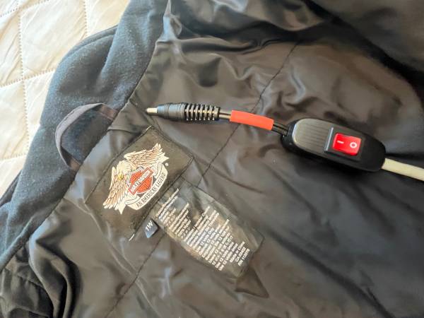 Connects to bike’s 12V electrical system for fast warmth through chest, back, & complete arms. No lithium battery to charge. Hooks up to battery under seat with switch always accessible for quick easy use anytime. Used during cold weather rides, still looks like new. Excellent condition. Feels like warm electric blanket wrapped around you. New ones are $250, some bad reviews. This has always worked with no problem. Has hook ups in sleeves for heated gloves. I take size M or L, this liner fits under L jacket. No longer riding, sold bike. Many items to sell.