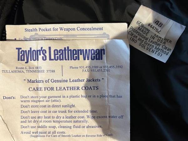Taylor's leather police jacket in new condition. Size 48 barely worn maybe 10 times. Very heavy and insulated. Badge plate and boards can be taken off. Cost over $600 new