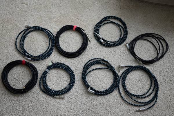 Selling a set of 9 used 15-ft 1/4″ instrument/audio cables — perfect for guitars, basses, keyboards, synths, pedalboards, patching studio gear or amps.