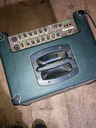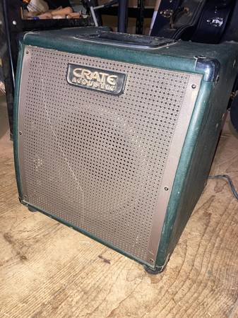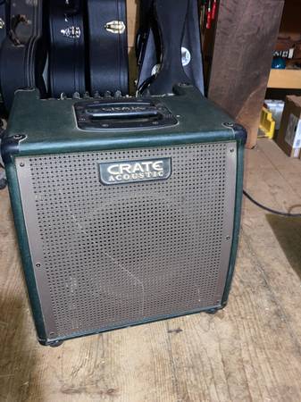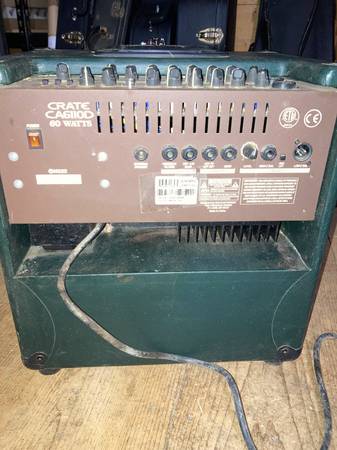 Crate CA6110DG Gunnison Acoustic Guitar Amplifier features 60W, a 10" speaker, 2 channels, master EQ, XLR and 1/4" input jacks, DSP, RCA inputs with level control, and XLR and 1/4" outs with ground lift and level control. Automatic feedback elimination circuit. Tested and working. Cosmetically in good condition consistent with age and wear.