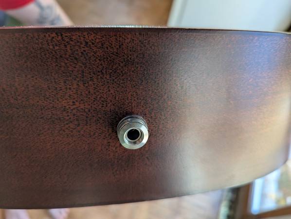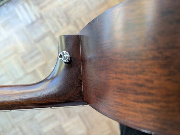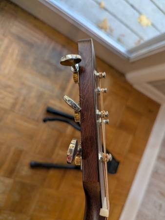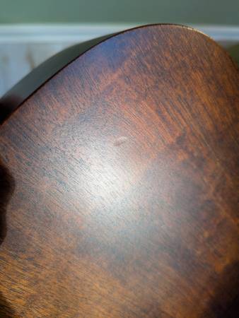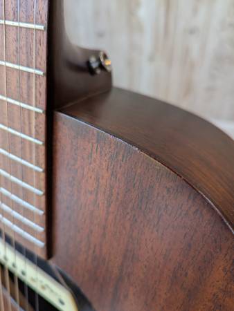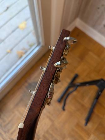 An amazing auditorium-sized mahogany guitar, made in the USA. Purchased new two years ago. Has since been set up by Mark Dobbyn of Retrofret and outfitted with a strap peg on the heel and an LR Baggs M1 passive soundhole pickup (with tail pin input), all installed by Nick at Holcomb Guitars. It's stage-ready and looks great. There are a couple of spots where there are impressions in the wood (near the tuning pegs, on the back, on the bottom front, and on the heel) most notably. Only the heel is anything I'd call "damage," which is likely from glancing off the wall when putting it back in its hanger at some point or another. I'd say this is Excellent, if not Near Mint/Like New. It comes with the case they sold it to me with (a "hard shell plush" semi-rigid case with backpack straps).