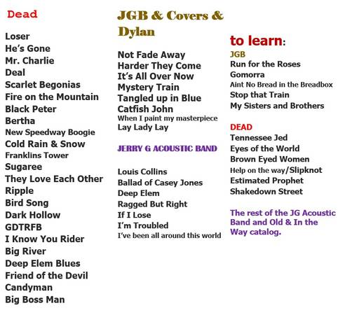 I have attached a list of songs I know, ranging from very well to "I've played it before" as well as a list that I am working through. Looking to get together maybe 2 or 3 times a month. Unfortunately I don't have a place for a band to play, but I am pretty easy going, no drug, alcohol, ego, or drama issues.