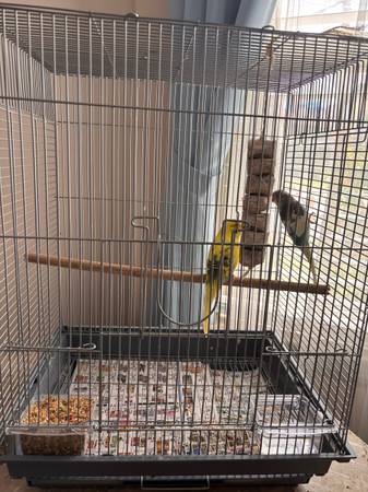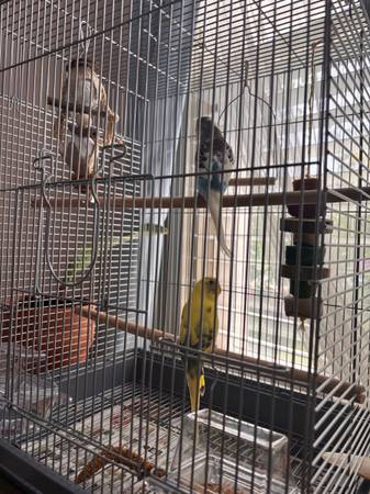 Got them for my moms birthday, she was sad because they can't talk or haven't warmed up to her yet. They aren't too noisy and their very nice. They do like the shredding toy and I just got them a new coconut toy. Includes cage, seeds, feeders and perches inside. I'm asking $150 for it all. They are still babies too, so plenty of time to bond with them!