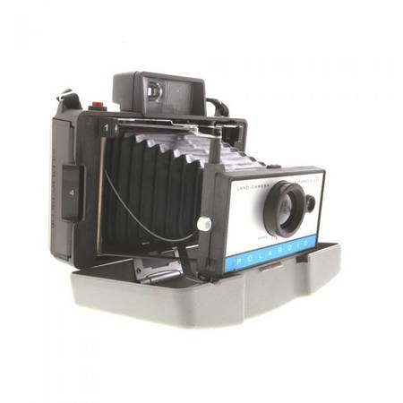 The Polaroid 210 instant film camera with attached M3 bulb. Shutter speed is 1/1200 in 10 seconds, an aperture of f/8.8 to f42, this instant film camera can produce sharp and vibrant pictures. Features a 2-element lens to optimize light transmission and give precisely illuminated pictures. The Imagesizer viewfinder of the Polaroid 210 instant film camera, gives a clear and magnified view of the scene to be photographed.