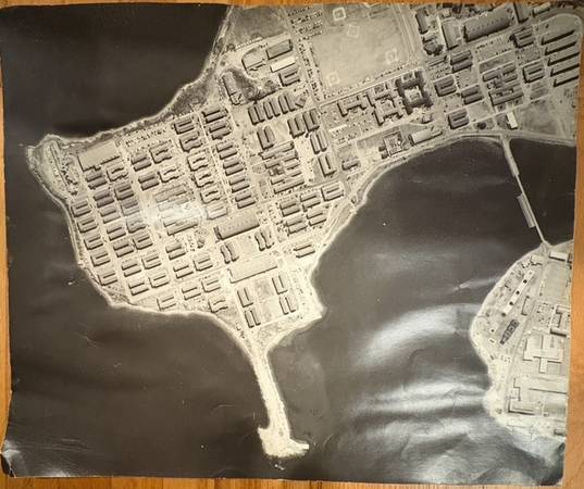 Vintage Aerial Photo (1957) of Newport Naval Station, Codding Point. Photo taken from aircraft from Quonset Point Naval Air Station. 23" x 19"