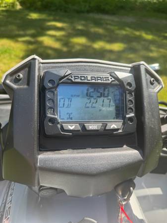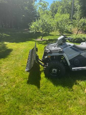A like new Polaris Sportsman 450 Utility Edition, gray, with an attached plow kit. Like new condition with only 222 miles.