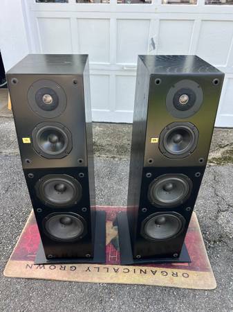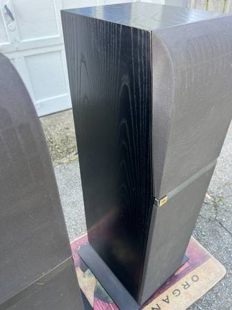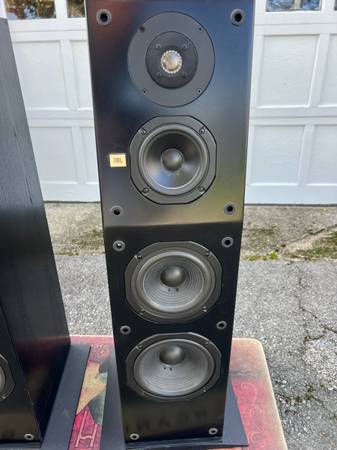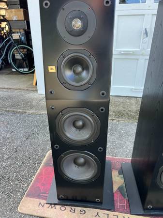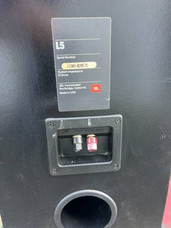 Awesome JBL L5 speakers in excellent condition and sound amazing. Reasonable sized floorstanders. They play loud and clear. A couple minor cosmetic flaws that could be touched up easily. They are hooked up in my garage for demonstration. You won't find better speakers for $399 firm.